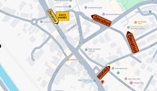 La rue de la mairie sera barrée, une déviation sera mise en place par la rue de Verdun/rue Saint-Exupéry et rue de l’Egalité