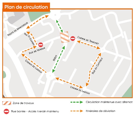 - Les accès aux chemins de Trinchet et à la rue de Verdun seront fermés à la circulation pendant les travaux
